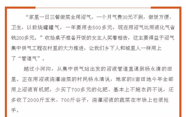 “农村沼气集中供气模式,既为农民提供优质生活用能,优化农村能源消费结构,又提高了农产品质量,推动有机生态农业和循环经济发展,还促进了低碳经济发展,堪称一举多赢,是农村沼气建设的‘二次革命’,也是农业转型升级的重要抓手。”刘勇说。(全媒体记者 贾明高)